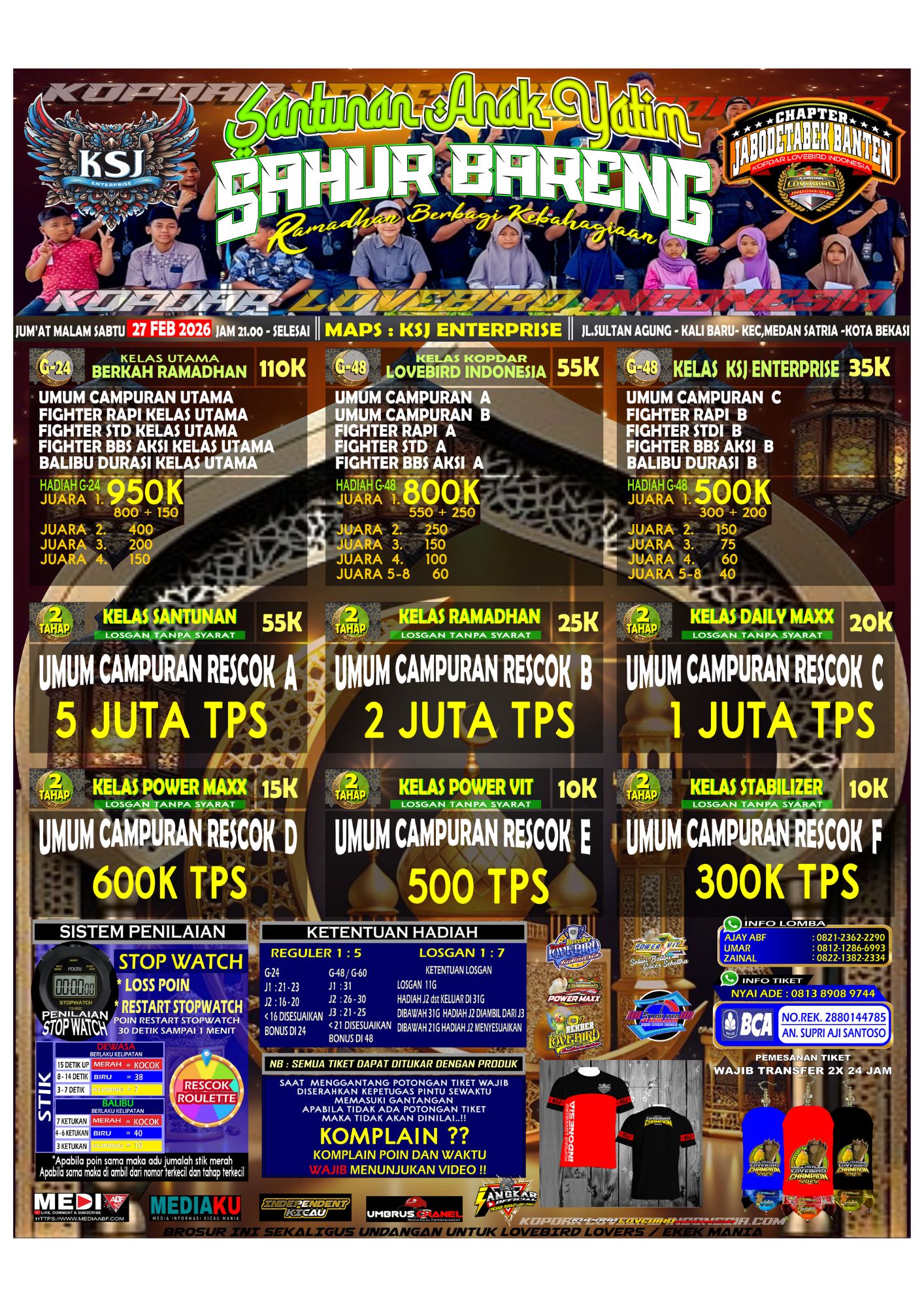 Kegiatan KLI: Santunan & Sahur Bareng di KSJ EnterpriseKomunitas Kopdar Lovebird Indonesia (KLI) kembali menunjukkan kepeduliannya melalui kegiatan sosial bertajuk Santunan dan Sahur Bareng. Acara ini akan digelar pada Jumat Malam Sabtu, 27 Februari 2026, bertempat di gantangan KSJ Enterprise.Kegiatan ini menjadi momen istimewa karena tidak hanya mempererat solidaritas antaranggota komunitas lovebird, tetapi juga menghadirkan kepedulian nyata kepada anak-anak yatim dan masyarakat sekitar. Dalam suasana penuh kebersamaan dan kekeluargaan, KLI ingin membuktikan bahwa komunitas pecinta burung tidak hanya fokus pada hobi dan kompetisi, tetapi juga aktif dalam kegiatan sosial dan kemanusiaan.Rangkaian acara akan diawali dengan santunan kepada anak-anak yatim, dilanjutkan dengan tausiyah singkat untuk menambah keberkahan malam, dan ditutup dengan sahur bersama seluruh anggota serta tamu undangan. Gantangan KSJ Enterprise yang biasanya ramai dengan lomba burung akan berubah menjadi tempat penuh kehangatan dan kebersamaan.Ketua dan panitia pelaksana berharap kegiatan ini dapat menjadi agenda rutin tahunan KLI, sekaligus memperkuat citra komunitas sebagai wadah yang solid, kompak, dan peduli sesama.Dengan semangat kebersamaan dan tagline kebanggaan, KLI terus berkomitmen menjadi barometer lovebird berkualitas, tidak hanya dalam prestasi, tetapi juga dalam aksi sosial nyata di tengah masyarakat.