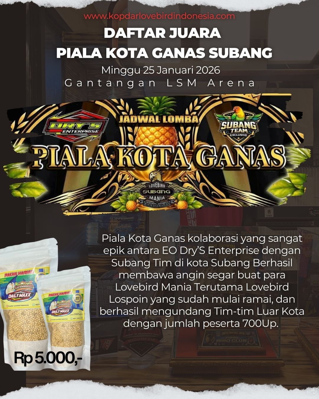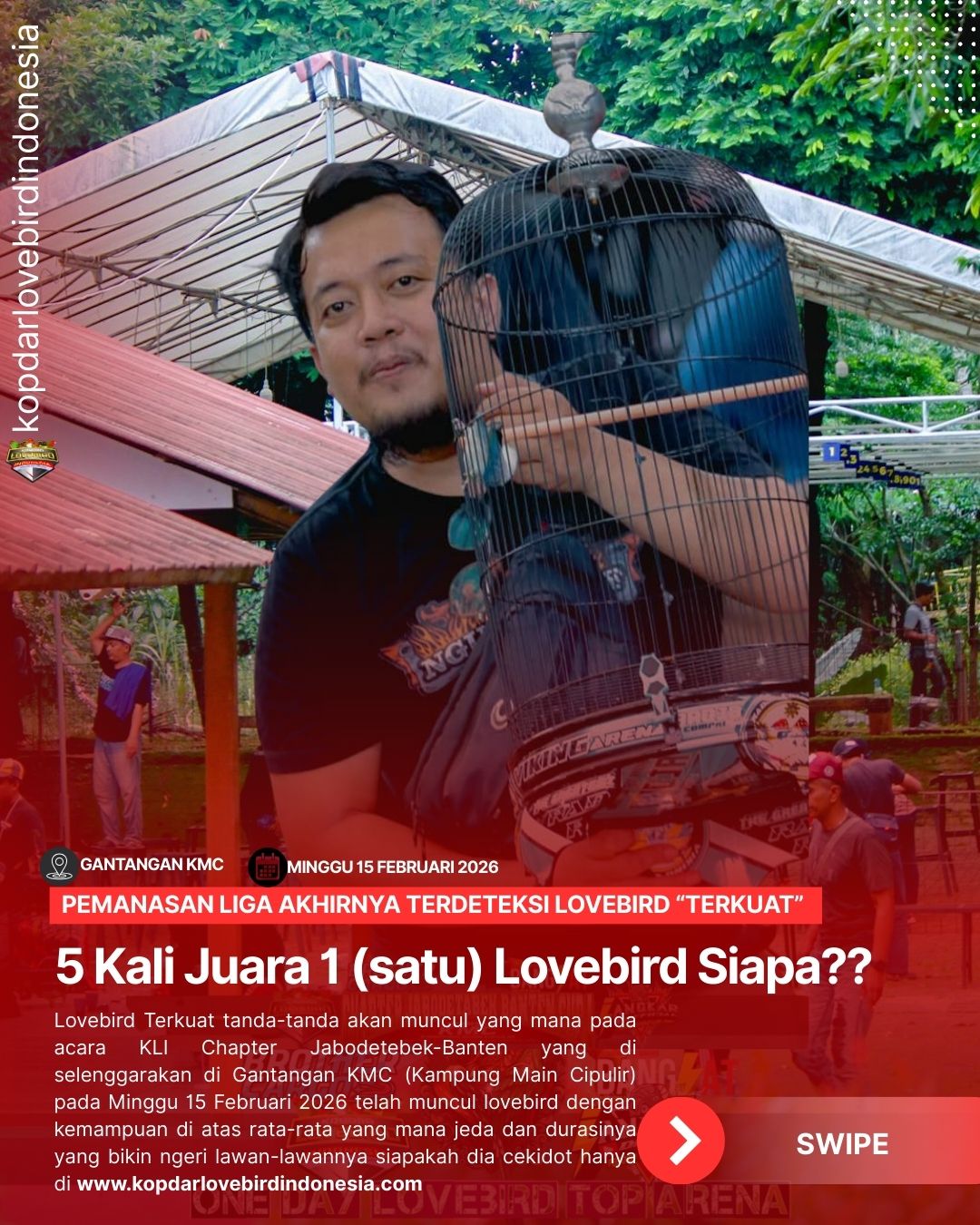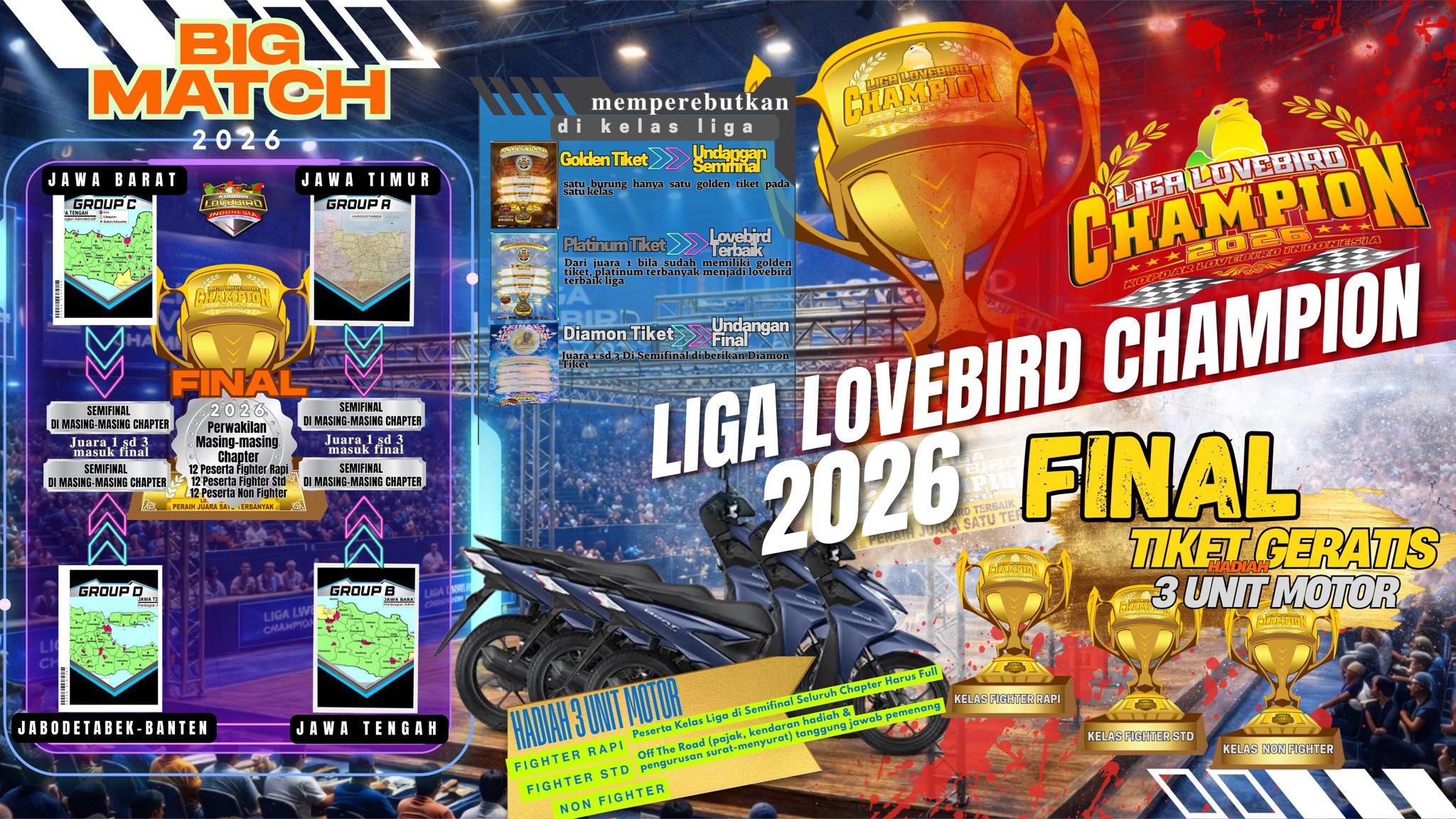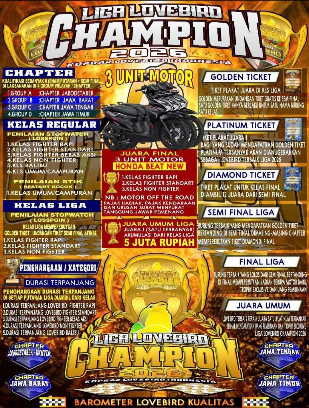 Liga burung paling bergengsi tahun ini siap digelar! Liga Lovebird Champion 2026 akan menjadi ajang pembuktian kualitas terbaik para lovebird dari berbagai daerah, dengan konsep liga yang lebih matang, sistematis, dan penuh gengsi.Diselenggarakan oleh komunitas besar pecinta lovebird, Kopdar Lovebird Indonesia, liga ini akan resmi dibuka pada bulan April 2026 dan berlangsung serentak di 4 chapter besar:• KLI Chapter Jawa Timur• KLI Chapter Jawa Tengah• KLI Chapter Jawa Barat• KLI Chapter Jabodetabek BantenSetiap chapter akan menggelar 6 kali babak penyisihan, sehingga para peserta memiliki kesempatan luas untuk mengumpulkan golden tiket untuk menuju Semifinal yang di selenggarakan masing-masing Chapter, pada semifinal juara 1 sd 3 bakal masuk dalam Laga Final. Sistem liga ini dirancang untuk menguji:• Konsistensi performa• Kualitas mental bertanding• Stabilitas durasi dan karakter suaraKonsep ini memastikan bahwa yang lolos ke final benar-benar lovebird terbaik, bukan hanya karena faktor keberuntungan semata.Liga Lovebird Champion 2026 akan mempertandingkan 3 kelas utama liga di samping kelas-kelas reguler yang lain.1. Fighter Rapi2. Fighter Standar3. Non FighterKetiga kelas ini menjadi kategori favorit di dunia gantangan, karena masing-masing memiliki karakter penilaian dan daya tarik tersendiri.Sebagai bentuk apresiasi terhadap kualitas peserta, panitia menyiapkan hadiah final yang luar biasa, yaitu: 3 Unit Motor Baru— masing-masing untuk juara di kelas Fighter Rapi, Fighter Standar, dan Non Fighter.Hadiah ini tentu menjadi motivasi besar bagi seluruh peserta dari empat chapter untuk tampil maksimal sejak penyisihan pertama.Lebih dari sekadar kompetisi, Liga Lovebird Champion 2026 juga menjadi wadah:• Silaturahmi antar komunitas• Adu kualitas lovebird terbaik antar daerah• Pembuktian breeding dan settingan terbaikAtmosfer persaingan sehat antar chapter dipastikan akan menghadirkan tensi tinggi namun tetap menjunjung sportivitas.Dengan sistem liga yang panjang, hadiah bergengsi, dan dukungan penuh dari komunitas, Liga Lovebird Champion 2026 diprediksi menjadi salah satu event terbesar dan paling ditunggu di kalender gantangan tahun ini.Siapkah lovebird andalan Anda menjadi Champion 2026?