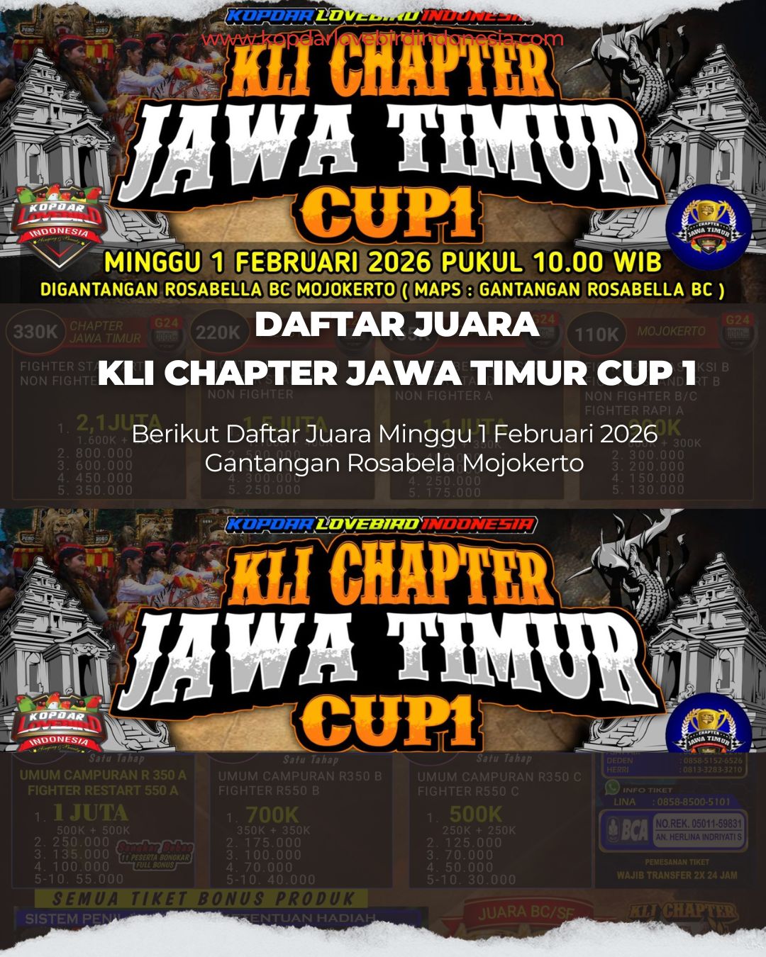 DAFTAR JUARA KLI CHAPTER JAWA TIMUR CUP 1MINGGU 1 FEBRUARI 2026GANTANGAN ROSABELA MOJOKERTOJUARA/KELASNAMA BURUNGNAMA PEMILIKALAMAT UMUM CAMPURAN R 350 1GADISNV GENKZNV GENKZ2TERJANGNV GENKZNV GENKZ3BACOTH. RIFQIYMENTE CITY BALIBU C 1TEMONMR. PRASSAOT BC2HIMALAYAMR. BOS QMR. BOS Q FIGHTER STANDAR C 1BOMBERKNADT KNA2DEK NONIKRAMASAOT BC3ALPHARDST 22ZICONG SF4SAKINAHFAIZSDS CREW MLG NON FIGHTER B 1STAR ONENV GENKZNV GENKZ2MAHALININV GENKZNV GENKZ FIGHTER BEBAS AKSI B 1BANASPATIABAH MUNIPKASTA SF2SUMINTENEMILJAPAN SF3RERENV GENKZNV GENKZ4EMBUNKJ NIKOSAOT BC FIGHTER RAPI C 1CITRA KIRANANV GENKZNV GENKZ2CLARAPHISSSAOT BC3GARAM CINANV GENKZNV GENKZ4LEWISNUBAKUL CRLIK SF UMUM CAMPURAN RESTAR 350 C 1SUROKNADT KNA2TERJANGNV GENKZNV GENKZ3SARJANA MUDAILHAMSILIWANGI4PJDJOLY JOEARAK BC5MICKYCINDYRG6AJENGMR PETEKJAVA7GMKNADT KNA NON FIGHTER KLI 1UJANGNV GENKZNV GENKZ2BINTANG-PENTASNV GENKZNV GENKZ3NNNNNN FIGHTER STD JATIM 1JNMR NIKOSAOT BC2RATU BLORONGMR RIFKYRATOH EMBOH3CINTAMR TONISAOT BC FIGHTER RAPI A 1PUTRI KELANAMR FERIAMBASADOR SF2ANDAADHI PJPTAAC BALIBU A 1TEMONMR PRASSAOT BC UMUM CAMPURAN B 1BRIMONV GENKZNV GENKZ2XENIARONYARUDAM3BINTANG PENTASNV GENKZNV GENKZ4BACOTH. RIFQIYMENTE CITY FIGHTER RESTAR 500B 1ZAMORANOKNADT KNA2PUTRI DIANAPUTRA KAREBETTRIPLE F TEAM3BORUTO JRMR. KHARNAHEREX SF4TERJANGNV GENKZNV GENKZ5QUEENWOON BASKWOON FARM6QUEENWOON BASKWOON FARM7AHESWARIANGGRIAWANGANTI SF8CINTAALBROTHER FIGHTER STANDAR KLI 1REBOORNANGGADT2DELPIEROPUGUHDT3JNMR NIKOSAOT BC TIKET UTAMA NON FIGHTER JATIM 1UJANGNV GENKZNV GENKZ FIGHTER RAPI B 1LANGGENGSAOT BCSAOT BC2PUTRINV GENKZNV GENKZ3NDOROBEIIFANRRF MALANG FIGHTER BEBAS AKSI KLI 1BOMBERKNADT KNA BALIBU B 1TEMONMR PRASSAOT BC UMUM CAMPURAN R 350 A 1CANTIKSAIFULNV GENKZ2BIDENMR ROBYSAOT BC3JELITAROLANDSAOT BC NON FIGHTER A 1BRIMONV GENKZNV GENKZ FIGHTER BEBAS AKSI A 1BOMBERKNADT KNA2BANASPATIH. ABAH MUNIPKASTA SF3RKMH NASRULSAOT BC4HABIBAHH LUTFIMALANG UMUM CAMPURAN A 1GADISRONYNV GENKZ2BRIMONV GENKZNV GENKZ FIGHTER STANDAR A 1JNMR NIKOSAOT BC2DEK NONIKRAMASAOT BC3RATU BLORONGMR REFKYRATOH EBUH FIGHTER STANDAR 550 A 1L 300KHOLISDT KNA2TERJANGKAJI ADIDT KNA3JELITAROLANDDT KNA4PUTRI DIANAPUTRA KAREBETTRIPLE F TEAM5QUEENWOON BASKWOON FARM FIGHTER RAPI D 1NNNNNN2GARAM CINAWOON BASKWOON FARM3MANUKKUMERTOSAOT BC NON FIGHTER C 1BRIMONV GENKZNV GENKZ FIGHTER STD B 1DELPIEROMR ANGGASAOT BC2RATU BLORONGMR RIFKYRATOH EBUH3MELANIVARELLYSEKTOR BARAT UMUM CAMPURAN RESTAR 350 B 1MAHESAMR FAJARSAOT BC2JELITAMR ROLANDSAOT BC3BIDENMR ROBYSAOT BC FIGHTER BEBAS AKSI C 1BOMBERKNADT KNA2BANASPATIABAH MUNIPKASTA SF3LB MAWARMR IMAMTITIPAN ILAHI FIGHTER RESTAR 550 C 1NINGRATVARELLYSEKTOR BARAT SF2AJENGMR PETEKJAVA3PUTRI MINACIMENKS L KT4XENIARONYARUDAM FIGHTER STD D 1HABIBAHH LUTFIMALANG2JNMR NIKOSAOT BC3RATU ICLIKABAH SANTOSOMANOK TA3K4DEK NONIKRAMARPM SF5GADISRONYARUDAM UMUM CAMPURAN C 1BRIMOALBEKKRATON SF FIGHTER BEBAS AKSI D 1BANASPATIABAH MUNIPKASTA SF2HABIBAHH LUTFIMALANG3LB MAWARMR IMAMTITIPAN ILAHI4PUTRIANGSAMR NIKOSAOT SF