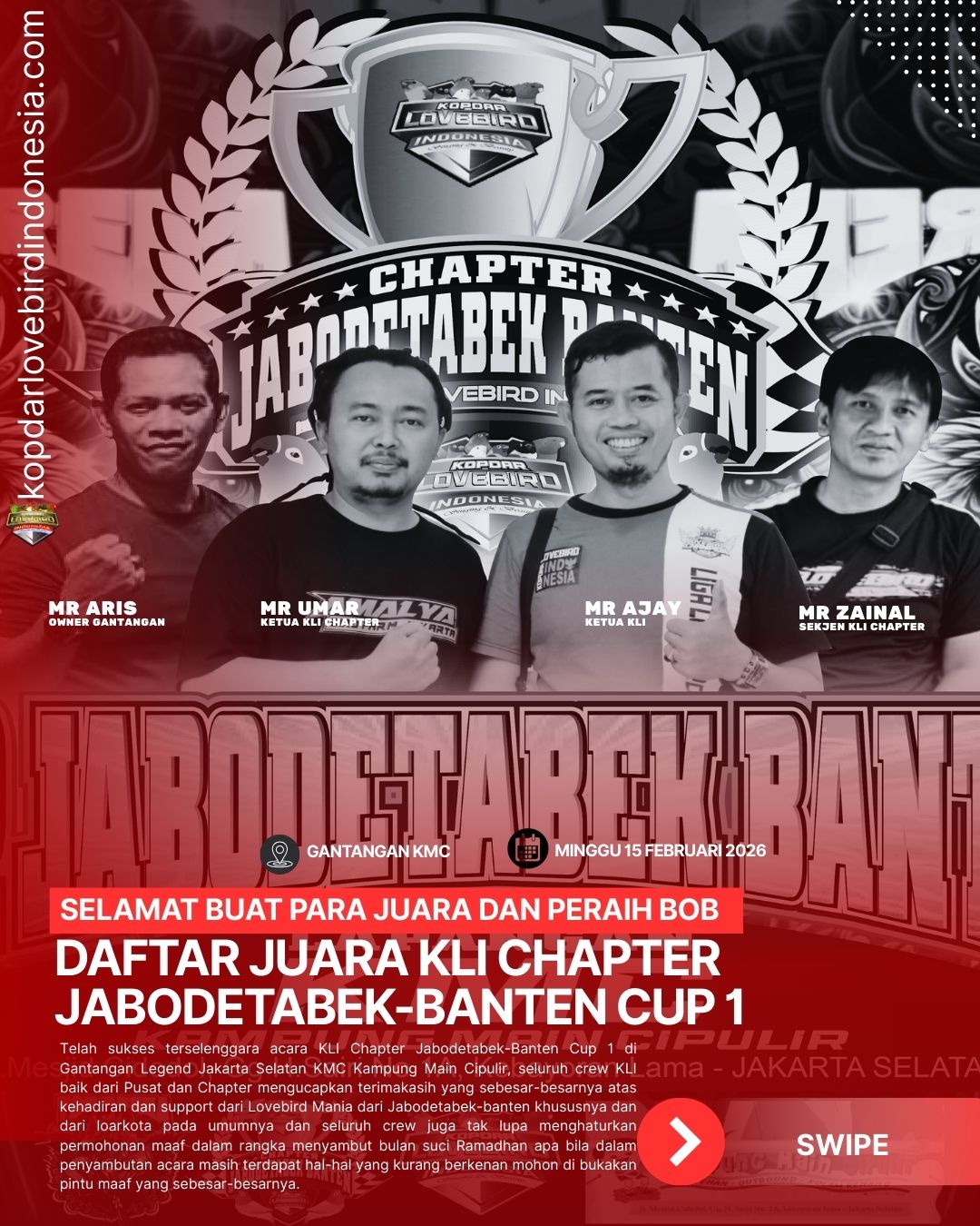 DAFTAR JUARA KLI CHAPTER JABODETABEK-BANTEN CUP 1MINGGU 15 FEBRUARI 2026GANTANGAN KMC (KAMPUNG MAIN CIPULIR)JuaraNama BurungNama PemilikAlamat Umum/Campuran Rescok 1BEBEKGANDENMANISE SF2SINDENMR. TIYANHANTU LAUT SF3JALUDEDISENGKETA SFBalibu C 1GALANGH.SOFYANDEMANG BC2SI MAUNGH.TOMOSELOW SF3SI MAUNGH.TOMOSELOW SF4TEJOMR. CHONANJABLAY SF5ARJUNAH.DEDISENGKETA SF6SUMBARYOGACANTERA BCUmum/Campuran D 1LONGMANHENRI LODEMANG BC2ANGGUNMR.DEDENDEMANG BC3MOLYKAJI LEMUDEMANG BCFighter Rapi C 1ZAENABBEDULSELOW SF2JALUDEDISELOW SF3DOYOKINDRASELOW SF4ARGO BROMOH.ARIFSELATAN KBYNon Fighter C 1TANGGOFAJAR LANADEMANG BC2LONGMAENHENDRI LOMABES SQUADBalibu Rescok B 1 2SRIKANDIH.KITUKSELOW SFNon Fighter A 1TANGGOFAJAR LANASELOW SF2LONGMANHENDRI LOMABES SQUADFighter Rapi Utama 1ANAK MAMIH.ZILDANSELOW SF2ZAENABBEDULSELOW SFFigter Bebas Aksi A 1DIANAMAS ROYDEMANG BCNon Fighter UTAMA 1TANGGOFAJAR LANADEMANG BC2LONGMANHENDRI LOMABES SQUAD3ANGGUNH.DEDENBART SIMPSONBalibu Tantangan 1DORAMIADITSELOW SF2UNYU UNYUH.KIKIDEMANG BC3GALANGMR.KAMALSELOW SFNon Fighter E 1TANGGOFAJAR LANADEMANG BC2DELLONDHAYU WIJAYAFIRE EXTING UISHTER3MOLYKAJI LEMUDEMANG BCUmum/Campuran Rescok B 1CENGEHUDA101 BC2GENDISUPITBARAYA SF3TAKDIRMR.KAMALAWS SF4BUNGAFIRMANULTRAMANFigter Bebas Aksi Utama Free Jamnper 1ALEXAMR.DEDENNGUMPUL SF2MENORIYANMAX'S SF3KEN AROKH. ADISPARTA SFFighter Rapi A 1CENGEHUDA101 BC2DOYOKINDRASELOW SFNon Fighter B 1TANGGOFAJAR LANANGUMPUL SF2ANGGUNH.DEDENBART SIMPSONBalibu A 1MAUNGUTOMOPETUKANGAN2UNYU UNYUH. KIKIMDR SF3GALANGMR.KAMALSELOW SF4HONGZUSONNYRING DS5SEMPERPAPA RAFIBABY SNOT SFFighter Standar Utama Free Jamper 1DIANAMAS ROYSELOW SF2ROBITAMR. REZASELOW SF3RATU SUMEKARH.SOFYANDEMANG BCNon Fighter D 1MOLYKAJI LEMUDEMANG BC2TANGGOFAJAR LANANGUMPUL SFFigter Bebas Aksi B 1ALEXAMR.DEDENNGUMPUL SF2MENORIYANMAX'S SFBalibu B 1LS JRPSK SFJKR2GALANGMR. KAMALAWS SF3KUKU BAYUCUKEH101 BC