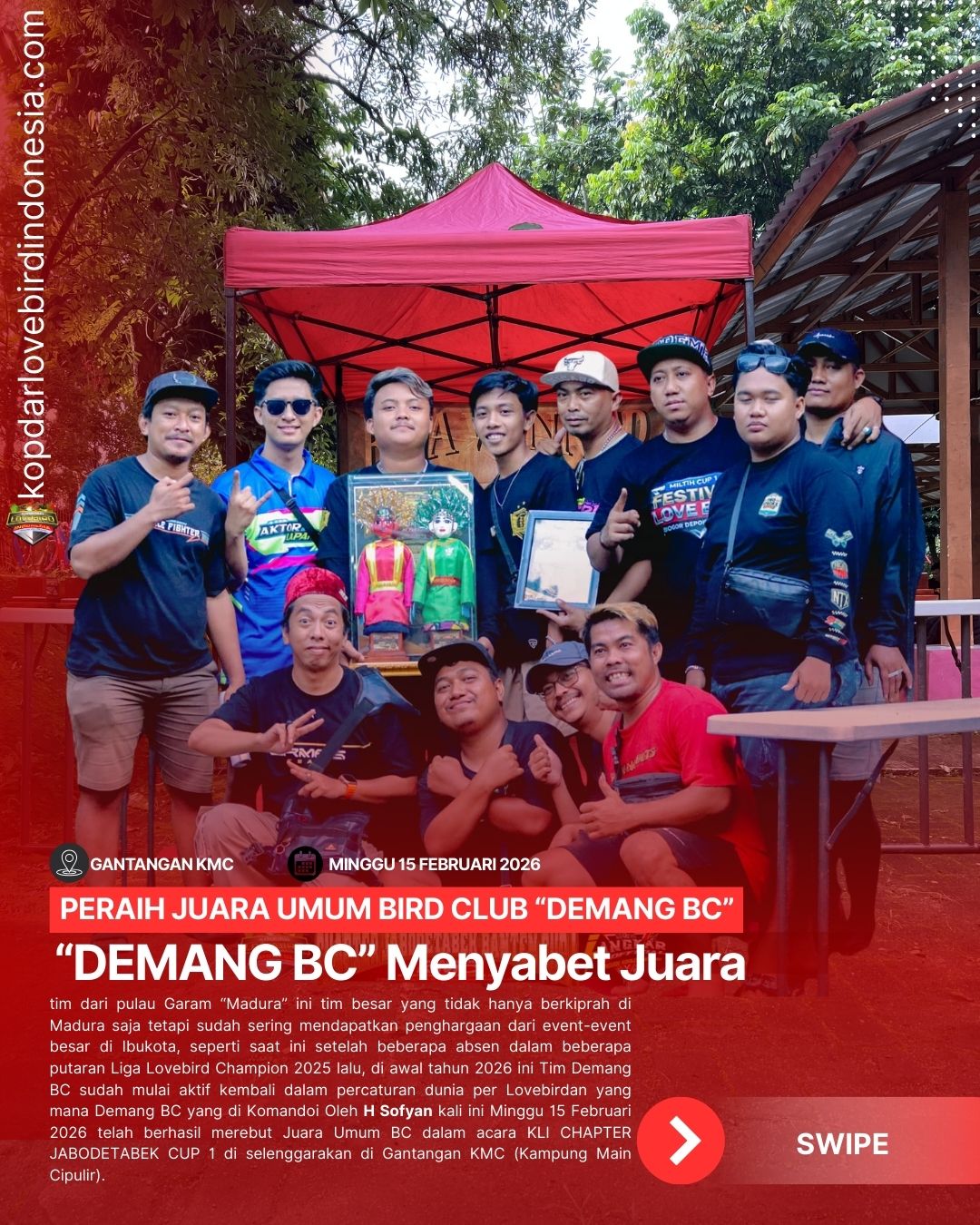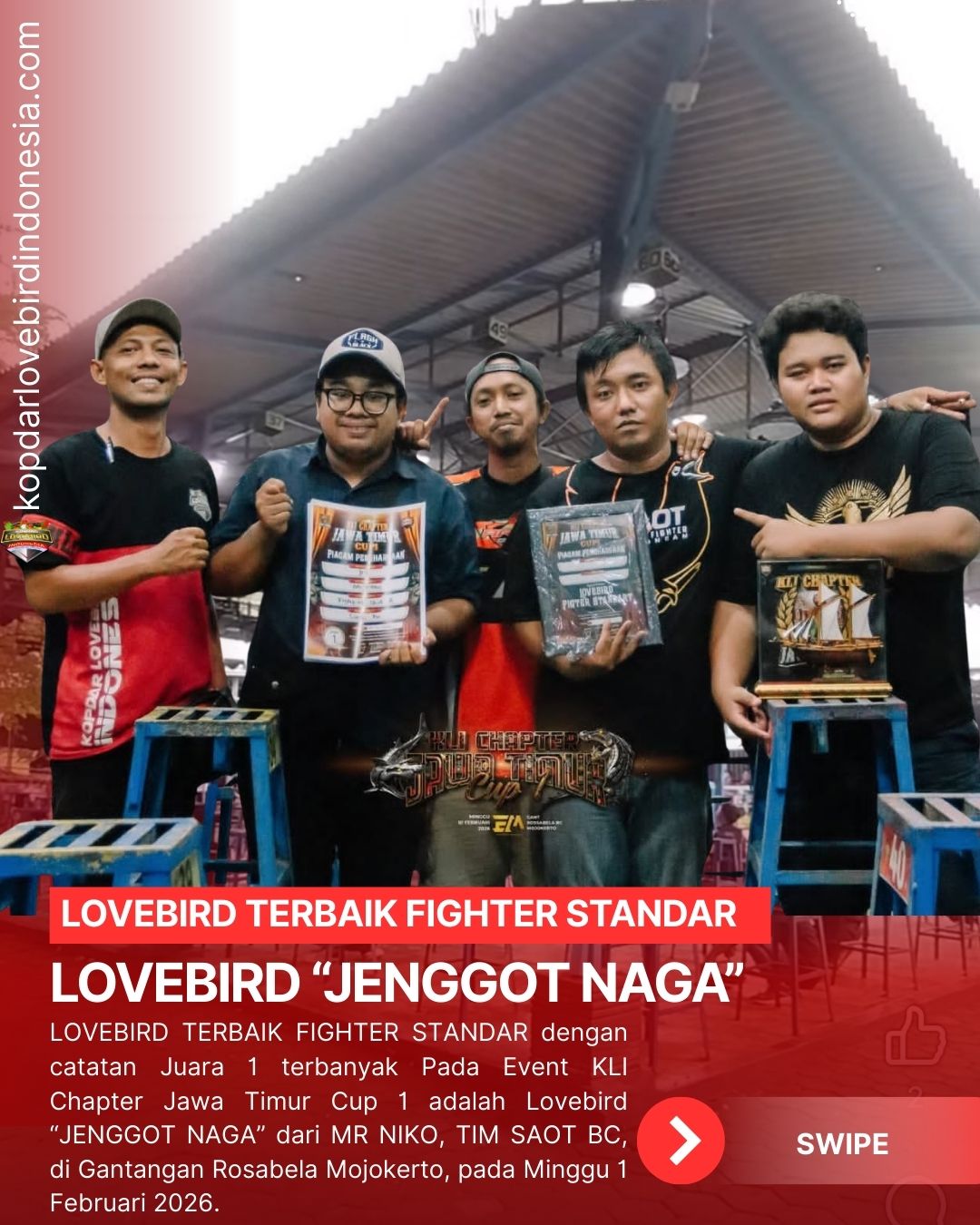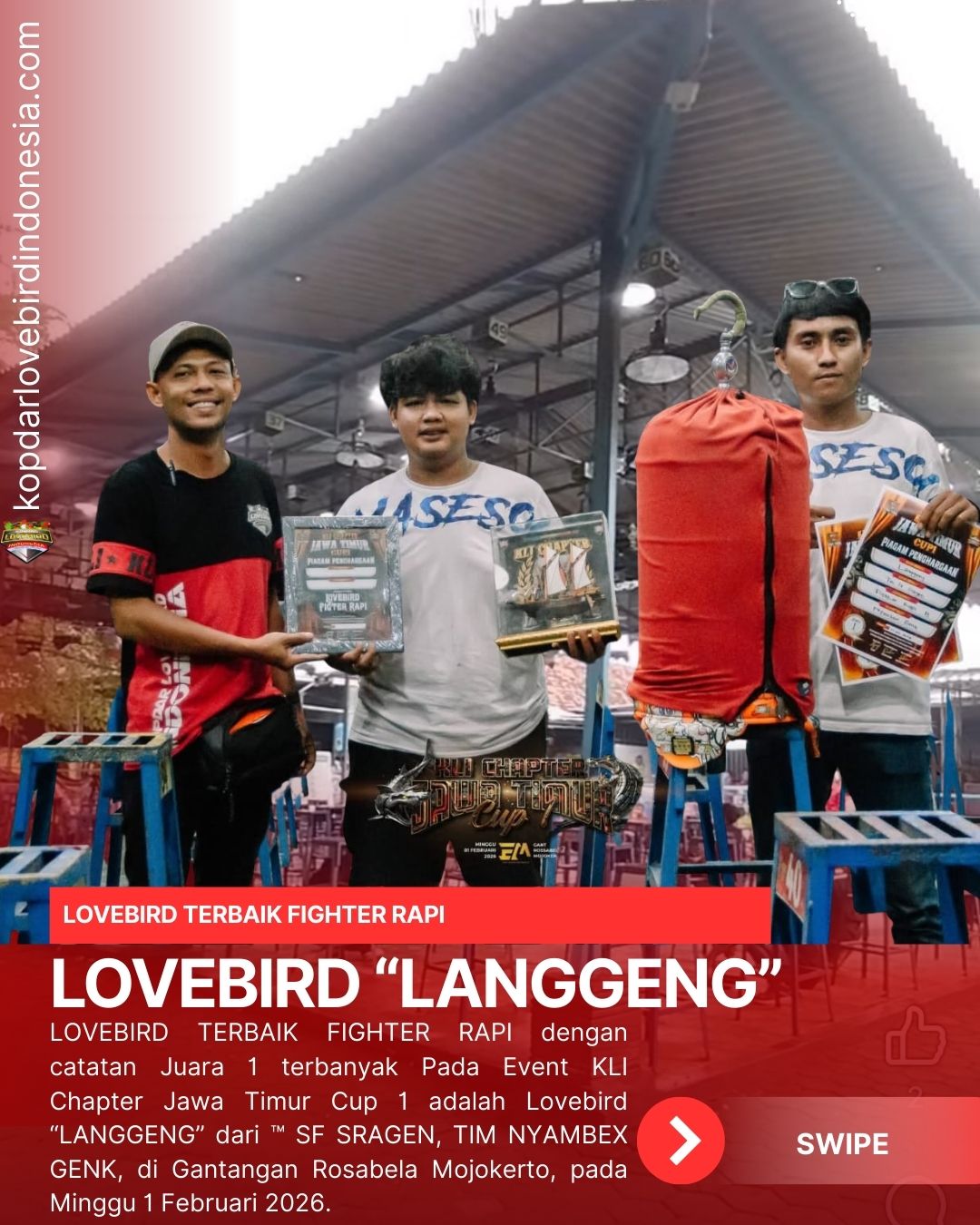 Lovebird “Langgeng” saat ini telah di nobatkan menjadi lovebird terbaik di kelas Lovebir Fighter Rapi karena mendapatkan juara 1 (satu) terbanyak pada event KLI CHAPTER JAWA TIMUR CUP 1, Lovebird Langgeng tampil memukau di depan para penonton meskipun persaingan sengit dengan lovebird-lovebird fighter jawa timur tak hanya itu cuaca juga kurang bersahabat dalamkondisi hujan tidak mengurangi performa “langgeng” untuk merebut juara.Meskipun lovebird langgeng datang dari jauh bersama Owner TM SF Sragen dan Tim Nyambex ternyata hal itu tidak menyurutkan semangat nya dan Tim dengan Memborong Tiket All sesi Fighter Rapi, Minggu 1 Februari 2026 menjadi hari baik buat Tim Nyambex sampai akhir acara dan pulang ke Jawa Tengah membawa tropi Eksklusif Lovebird Terbaik Fighter Rapi.adm--