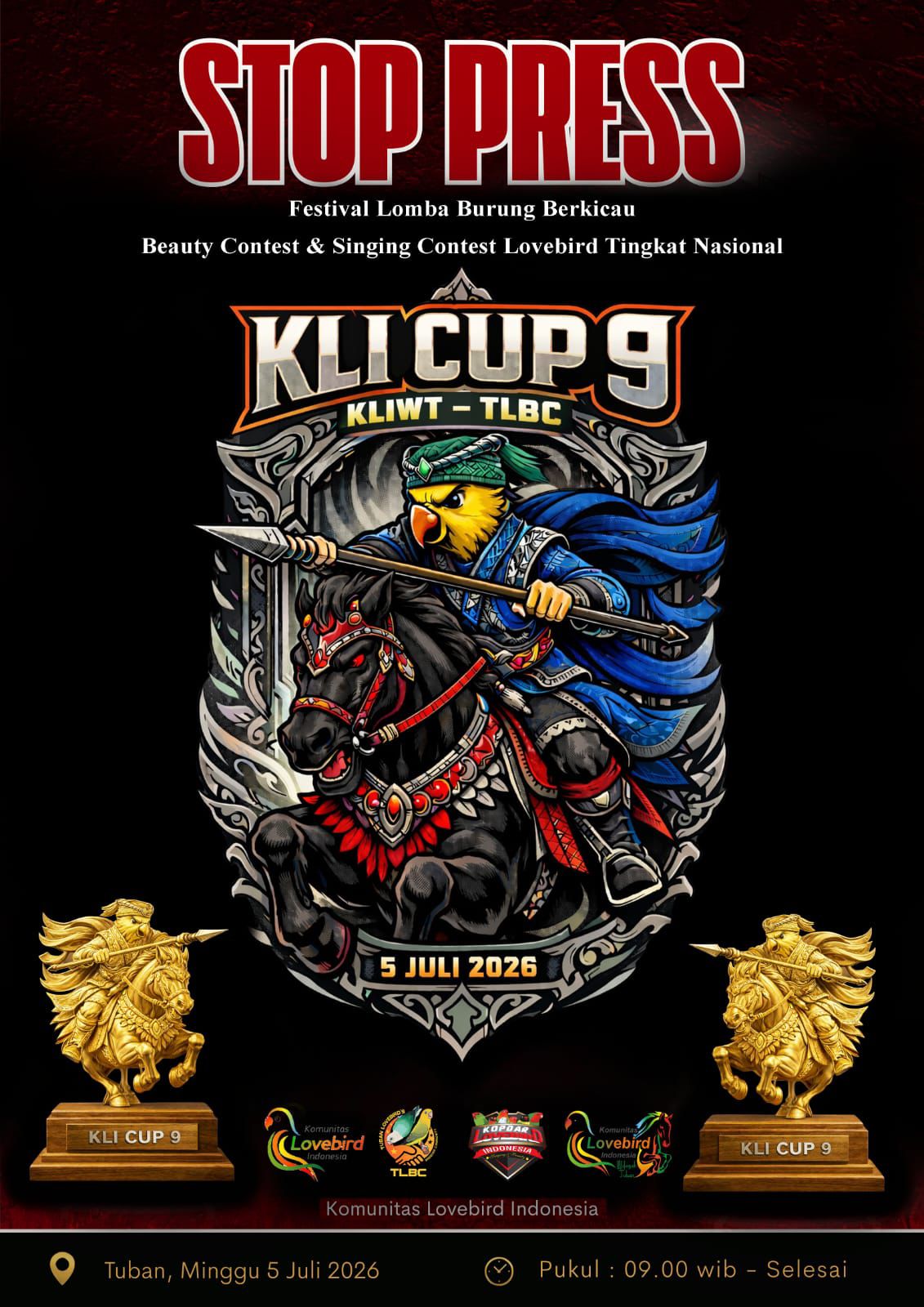 KLI (komunitas lovebird indonesia) merilis STOPPRESS KLI CUP-9 seperti mengemparkan seluruh jagat perlovebirdan nusantara berita ini menarik perhatian dari seluruh kalangan lovebird mania hal yang di tunggu-tunggu dari terkhir KLI CUP-8 di tahun 2024 yang di gelar di Jogja sampai saat ini baru terdengar berita kembali.KLI CUP-9 ini bakal di gelar di Jawa timur tepatnya di daerah KLI-WT atau Tuban yang mana memang di Jawa Timur pergerakan lovebird memang masih nyata apa lagi akhir-akhir ini sudah ramai dengan Mutasi terbaru yaitu Yellow Face yang Nominalnya masih di atas puluhan juta dengan gabungan dari jenis mutasi bronze fallow dan lain-lainnya.KLI CUP-9 ini sesuai dengan Stoppress bakal diselenggarakan pada tanggal 5 Juli 2026 yang bakal mempertandingkan Singing Kontes yang bakal digarap oleh KLI Kopdar Lovebird Indonesia dan beauty contest bakal di selenggarakan oleh Komunitas Lovebird Indonesia yang berada dalam satu lokasi di bawah naungan Komunitas Lovebird Indonesia Korwil Tuban.