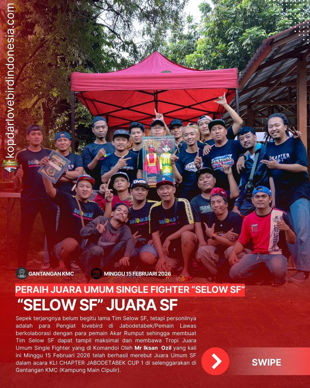 Tim Selow SF terdengan baru dalam telinga lovebirdmania memang tim Selow SF tergolong tim baru yang telah ber akselerasi karena anggotanya sudah tak asing lagi dalam dunia lovebird yang merupakan para penggiat lovebird mania dari jabodetabek-banten, dalam setiap kesempatan tim Selow SF telah sering mensupport gelaran event lovebird di Jabodetabek.Tim Selow SF kali ini mencoba bersaing dalam memperebutkan Juara Umum Single Fighter dalam acara KLI Chapter Jabodetabek-Banten Cup 1 yang mana acara di gelar di gantangan KMC (kampung main cipulir), Tim Selow SF yang di Komandoi Oleh Bos Ketuk dan Mr Iksan Ozil telah mengatur strategi untuk dapat memenangkan dan membawa Tropi Juara dengan mengerahkan gacoan-gacoan andalan Seperti Dejuna dan Mahkota di Fighter standar, tak hanya itu Selow SF juga menurunkan Amunisi Fighter Rapi, balibu dan Non Fighter.Target selanjutnya untuk tim Selow SF adalah Kelas Liga Lovebird Champion 2026 seperti yang di ungkapkan oleh Mr Ozil dan Mr Ketuk yang bakam mensupport gelaran lovebird mania di manapun berada.